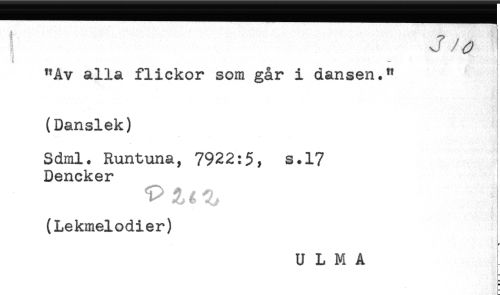 //// J/^y //// "Av alla flickor som går i dansen." //// (Danslek) //// Sdml. Runtuna, 7922:5, s.17 //// Dencker //// (Lekmelodier) //// U L M A ////