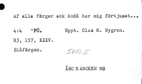 //// Af alla färger ack ändå har mig förtjusat*.* //// ! //// 4:4 Uppt. Clas M. Nygren. //// t //// R3, 157, XXXV. i //// Blåfärgen. Jf^, //// ÅBO R ANCKEN MS ////