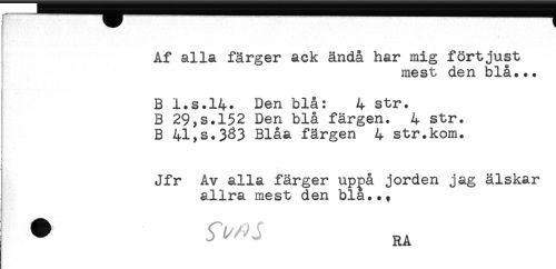 //// Af alla färger ack ändå har mig förtjust //// mest den blå... //// B l.s.14. Den blå: 4 str. //// B 29,s.152 Den blå färgen. 4 str. //// B 41,s.363 Blåa färgen 4 str.kom. //// Jfr Av alla färger uppå jorden jag älskar //// allra mest den bla.., //// + ^ ^ ////