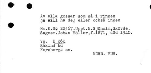 //// Åv alla gossar som gå i ringen //// ja will ha dej eller också ingen //// ^ Nm.E.U3 22567.Uppt.N.Sjöholm,Skövde. //// Sagesm.Johan Möller,f.1871, död 1940. //// Vg. D 262 //// Kåkind hd //// Korsberga sn. //// NORD. MUS. ////