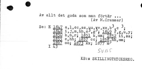 //// Av allt det goda som man förtär ... //// ! (Av M.Cramaer) //// Se: E lg^.7 a,l,cc,ss,uu,vv,xx,b^,c 3. //// 1848 i,j,m,hh igAg f,g,u,y; //// IS5 c,hh; 1857 cc: 185?7ÉE.mm: //// ^ 18ö7 00; ISTTlEx: 16771^3 //// KB:s SKILLINGTRYCKSREG. ////