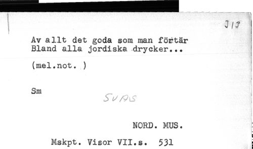 //// ! s //// Av allt det goda som man förtär //// Bland alla jordiska drycker... //// (mel. not. ) //// Sm i //// ) //// NORD. MUS. //// t //// Mskpt. Visor VII.s. 531 : ////