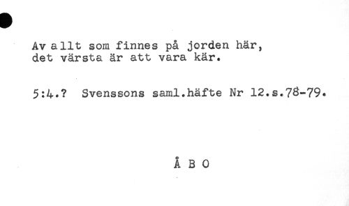 //// Av allt som finnes på jorden här, //// det värsta är att vara kär. //// 5:4*? Svenssons saml.häfte Nr 12.s.73-79* ////