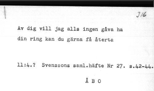 //// Av dig vill jag alls ingen gåva ha //// din ring kan du gärna få återta //// 11:4.? Svenssons saml.häfte Nr 2?. s.42-44. ////
