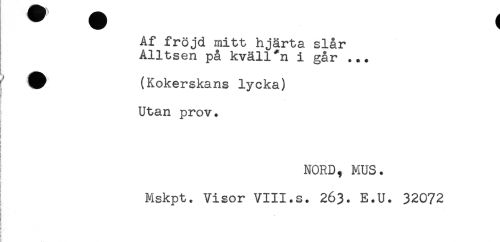 //// Af fröjd mitt hjärta slår //// Alltsen på kväll*n i går ... //// ^ (Kokerskans lycka) //// Utan prov. //// ! //// } //// t //// § //// NORD, MUS. //// i* //// < //// Mskpt. Visor VIII.s. 263. E.U. 32072 //// ! //// ! ' ////