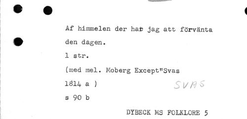 //// Af himmelen der hai? jag att förvänta //// ^ den dagen. //// 1 str. //// ! //// (med mel. Moberg Except"Svas //// 1814 a) ^i//'^ //// s 90 b //// DYBECK MS FOLKLORE 5 ////