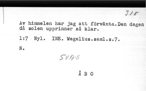 //// i J/<r //// ! //// T //// B * //// Av himmelen har jag att förvänta.Den dagen //// då solen upprinner så klar. //// 1:7 Nyl. INE. Wegelius.saml.s.7. //// N. ////