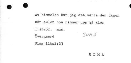 //// Av himmelen har jag att vänta den dagen //// * < //// när solen hon rinner upp så klar //// 1 strof. mus. //// Övergaard //// Ulma 11642:23 ////