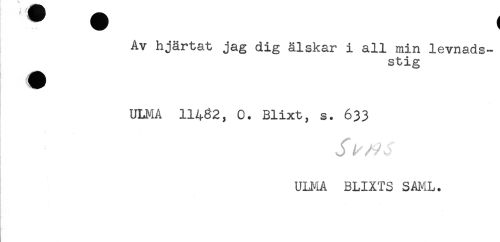 //// Av hjärtat jag dig älskar i all min levnads- //// stig //// * //// ULMA 11482, 0. Blixt, s. 633 //// Jl^/A- //// ULMA BLIXTS SAFIL. ////