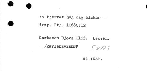 //// V s //// Av hjärtat jag dig älskar — //// ^ insp. Rtj. 10660:12 //// Earisson Björs Olof. Leksan. //// /kärleksvisor //// /RA IMSP. ////