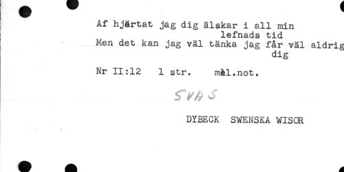 //// Af hjärtat jag dig älskar i all min //// lefnads tid //// Men det kan jag väl tänka jag får väl aldrig //// dig //// Nr 11:12 1 str. mål.not. //// DYBECK SWENSKA WISOR //// - ////