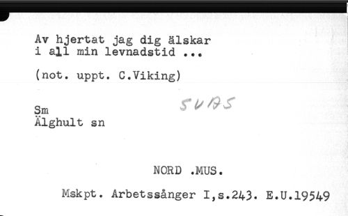 //// Av hjertat jag dig älskar //// i all min levnadstid ... //// (not. uppt. C.Viking) //// Sm ^^ //// Älghult sn //// NORD .MUS. //// Mskpt. Arbetssånger I,s.243. E.U.19549 ////