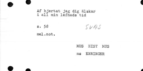 //// Af hjertat jag dig älskar //// i all min lefnads tid //// * //// s. 58 //// mel.not. //// * //// MUS HIST MUS //// ms ENNINGER ////