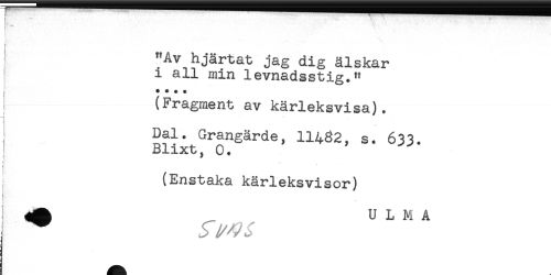 //// ** //// ' "Av hjärtat jag dig älskar //// i all min levnadsstig." //// + * * * //// (Fragment av kärleksvisa). //// Dal. Grangärde, 11482, s. 633. //// Blixt, 0. //// (Enstaka kärleksvisor) //// ! ^ U L M A ////