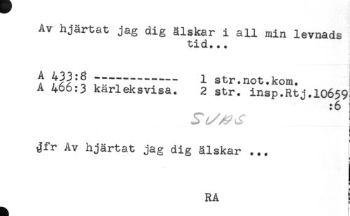 //// Av hjärtat jag dig älskar i all min levnads //// tid... //// j //// l} //// < //// t --- 1 str.not.kom. //// A 4ö6:3 karleksvisa. 2 str. insp.Rtj.10659; //// :6 } //// Jfr Av hjärtat jag dig älskar ... //// RA ! ////