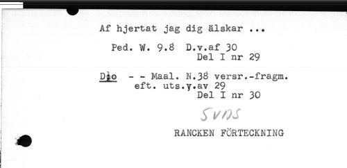 //// Af hjertat jag dig älskar ... //// Ped. W. 9.3 D.v.af 30 //// ] Del I nr 29 //// Djo - - Maal. N.33 versr.-fragm. //// eft. uts.y.av 29 //// Del I nr 30 //// RANCKEN FÖRTECKNING //// i ^ //// i ////