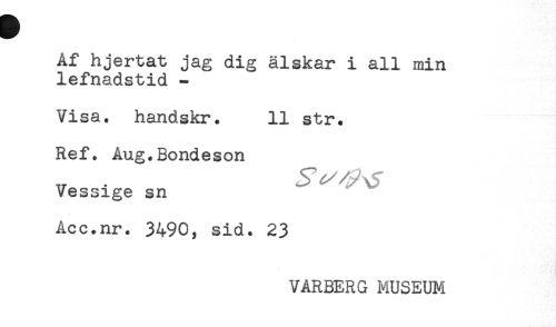 //// Af hjertat jag dig älskar i all min //// lefnadstid - //// Visa. handskr. 11 str. //// Ref. Aug.Bondeson //// Vessige sn //// Acc.nr. 3490, sid. 23 //// VARBERG MUSEUM ////