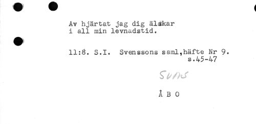//// Av hjärtat jag dig älskar //// i all min levnadstid. //// 11:8. S.I. Svenssons saml,häfte Nr 9. //// s.45-47 //// ÅBO ////