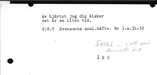 //// Av hjärtat jag dig älskar //// det är en liten tid. //// 9:3.? Svenssons saml.häfte. Nr 3*s.31-32 //// ! //// : //// ! * Jf^j ... ^^ //// ^ ÅBO ////