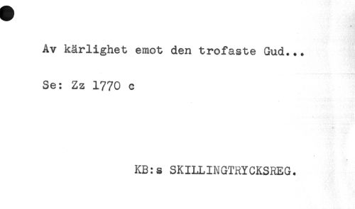 //// Av kärlighet emot den trofaste Gud... //// Se: Zz 1770 c //// # //// KB:s SKILLINGTRYCKSREG. ////