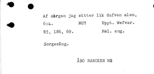 //// Af s&rgen jag sitter lik dufvan alen, //// t //// ^^ 6:4. MU? Uppt. Wefvar. //// R5, 186, 69. Mel. ang. //// < //// < //// Sorgesång. //// i //// ! ÅBO RANCKEN MS //// < //// \ ////