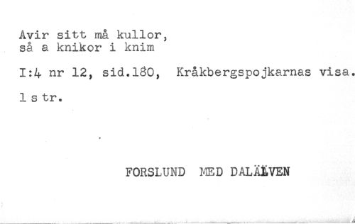 //// Avir sitt må kullor, //// så a knikor i knim //// 1:4 nr 12, sid.1^0, Kråkbergspojkamas visa. //// I s tr. //// § //// FORSLUND MED DALÄLVEN //// __ . ......^___-.... ////