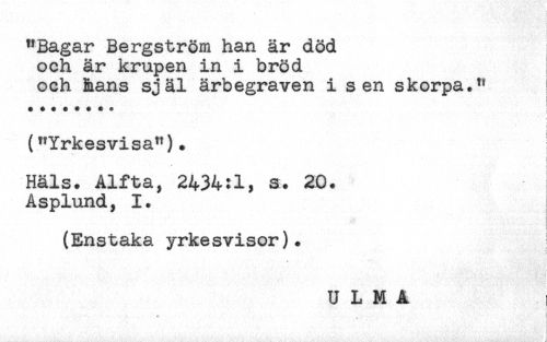 //// "Bagar Bergström han är död //// och är krupen in i bröd ! //// och hans själ ärbegraven i sen skorpa." ! //// i //// ! //// < //// ("Yrkesvisa"). //// i //// Häls. Alfta, 2434:1, a. 20* //// Asplund, 1. //// (Enstaka yrkesvisor)* //// t //// U L M A [ //// ! //// . ////