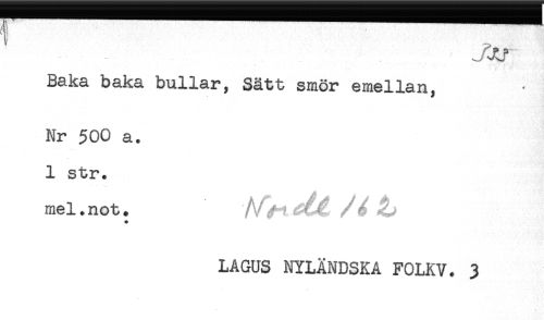 //// (. rj //// Baka baka bullar, Sätt smör emellan, //// Nr 500 a. //// 1 str. //// mel. not. * ? / é ^ //// # //// LAGUS NYLÄNDSKA FOLKV. 3 ////