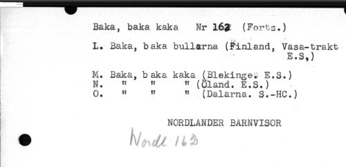 //// gy:...' //// Baka, baka kaka Nr 16% (Forts.) //// L. Baka, baka bullarna (Finland, Vasa-trakt //// E.SJ //// M. Baka, baka kaka (Blekinge^ E.S.) //// N. " " " (Öland. E.S.) //// 0. " " " (Dalarna. S.-HC.) //// r //// NORDLANDER BARNVISOR //// t. ////