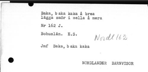 //// Baka, b aka kaka å brea //// lägga smör i mella å mera //// Nr 162 J. //// Bohuslän. E.S. //// Jmf Baka, baka kaka //// -j //// ^ NORDLANDER BARNVISOR ////