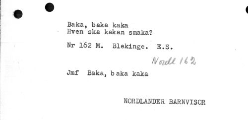 //// Baka, baka kaka //// Hven ska kakan smaka? //// Nr 162 M. Blekinge. E.S. //// Jmf Baka, baka kaka //// NORDLANDER BARNVISOR ////