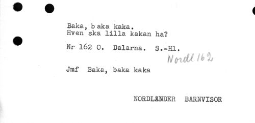 //// Baka, baka kaka. //// Hven ska lilla kakan ha? //// ^ Nr 162 0. Dalarna. S.-Hl. //// A/ # ^ ^ //// //// /Jmf Baka, baka kaka //// NORDLÄNDER BARNVISOR ////