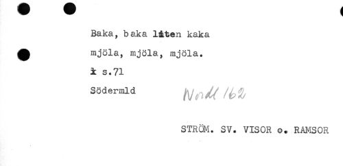 //// Baka, baka liten kaka //// ^ mjöla, mjöla, mjöla. //// i s.71 //// Södermld //// STRÖVt. SV. VISOR o. RAMSOR ////