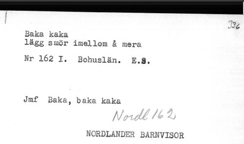 //// Baka kaka //// lägg smör imellom å mera //// Nr 162 1. Bohuslän. E.ä. //// * —^ //// Jmf Baka, baka kaka //// NORDLANDER BARNVISOR ////