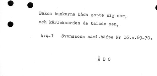 //// Bakom buskarna båda satte si"- ner //// o y //// ^ och kärleksorden de talade sen, //// 4:4.? Svenssons saml.häfte Nr 16.s.69-70. //// ÅBO ////