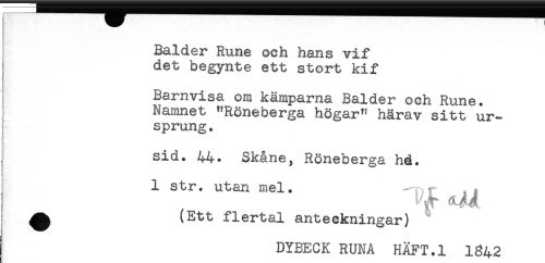 //// Balder Rune och hans vif //// i det begynte ett stort kif //// Barnvisa om kämparna Balder och Rune. //// : Namnet "Röneberga högar" härav sitt ur- //// ! sprung. //// H //// sid. 44. Skåne, Röneberga hd. //// <) //// i //// 1 str. utan mel. —T r . . //// ^ (Ett flertal anteckningar) //// [ DYBECK RUNA HÄFT.l 1842 //// ! ////