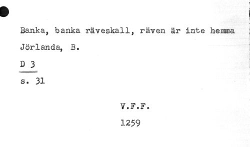 //// < //// Banka, banka räveskall, räven är inte hemma ! //// Jör landa, B. i //// i //// D 3 //// s. 31 //// v //// V.F.F. //// 1259 ////