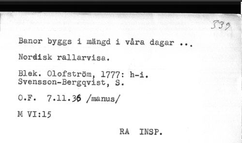 //// Banor byggs i mängd i våra dagar ... //// Nordisk rallarvisa. //// Blek. 01ofström, 1777: h-i. //// Svensson-Bergqvist, S. //// //// /< //// O.F. 7.11.3$ /manus //// /t //// M VI:15 //// RA INSP. ' ////
