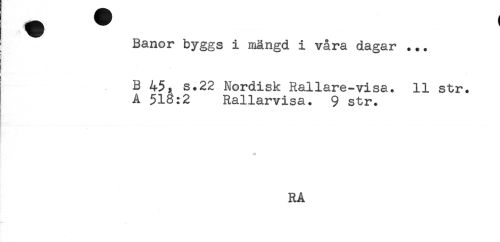 //// Banor byggs i mängd i våra dagar ... //// B 45, s.22 Nordisk Rallare-visa. 11 str. //// A 518:2 Rallarvisa. 9 str. //// RA ////