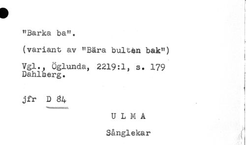 //// "Barka ba". //// (variant av "Bära bultan bak") //// Vgl., Öglunda, 2219:1) s. 179 //// Dahlberg. //// jfr D 34 //// U L M A //// tt //// Sånglekar ////
