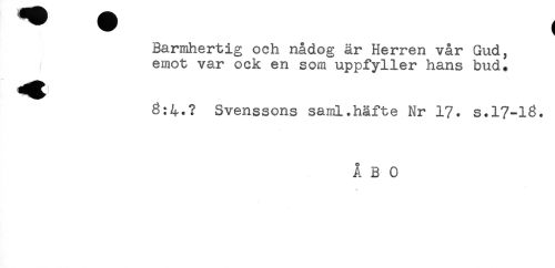 //// Barmhertig och nådog är Herren vår Gud, //// emot var ock en som uppfyller hans bud. //// 8:4*? Svenssons saml.häfte Nr 17. s.17-18. //// ÅBO ////