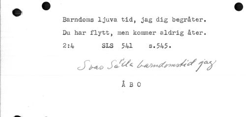 //// Barndoms ljuva tid, jag dig begråter. //// Du har flytt, men kommer aldrig åter. //// 2:4 SLS 541 s.545. //// ÅBO ////
