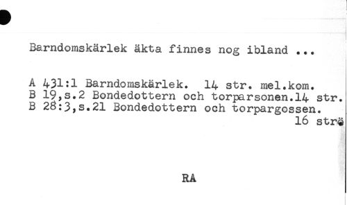 //// Barndomskärlek äkta finnes nog ibland ... //// A 431:1 Barndomskärlek. 14 str. mel.kom. //// B 19,s.2 Bondedottern och torparsonen.14 str. //// B 28:3,s.21 Bondedottern och torpargossen. //// 16 strö //// RA ////