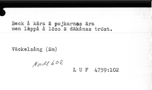 //// Beck å kära ä pojkarnas ära //// men Uppå å löss ä däkånas tröst. //// Väckelsång (Sm) //// i //// -- //// ! //// L U F 4759:102 //// i //// < //// < //// i ////