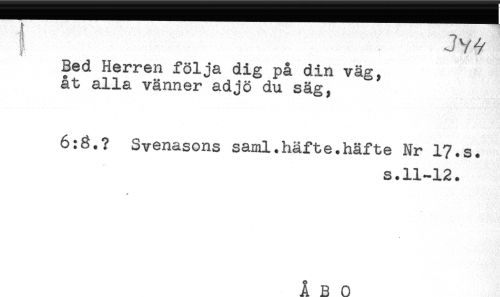 //// Bed Herren följa dig på din väg, //// a t alla vänner adjö du säg, //// 6:8.? Svenasons saml.häfte.häfte Nr 17.s. //// s.11-12. ////