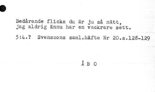 //// Bedårande flicka du är ju så nätt, //// jag aldrig ännu har en vackrare sett. //// 5:4.? Svenssons saml.häfte Nr 20.s.128-129 //// ÅBO ////