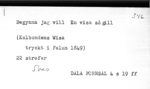 //// Begynna jag vill En visa sågi.11 //// (Kolbondens Wisa //// tryckt i Falun 1849) //// 22 strofer //// DALA FORNSAL 4 s 19 ff ////