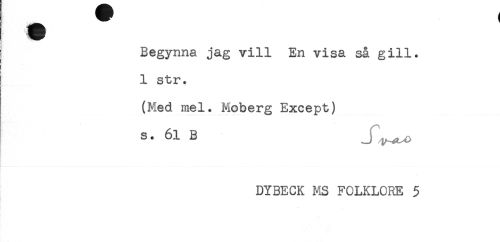 //// Begynna jag vill En visa så gill. //// 1 str. //// (Med mel. Moberg Except) //// s. 61 B Jlt^ //// DYBECK MS FOLKLORE 5 ////