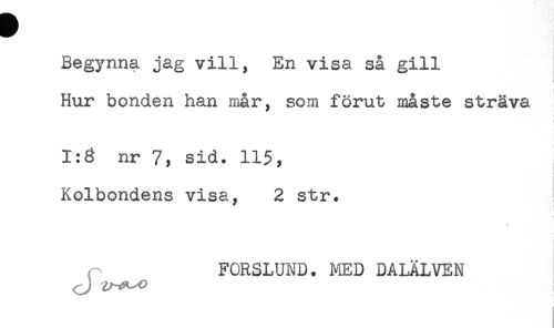 //// Begynna jag vill, En visa så gill //// ! //// Hur bonden han mår, som förut måste sträva //// 1:3 nr 7, sid. 115, //// Kolbondens visa, 2 str. //// ! //// FORSLUND. MED DALÄLVEN ////