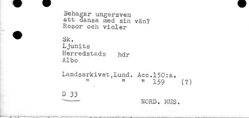 //// Behagar ungersven //// att dansa med sin vän? //// Rosor och violer //// * Sk. //// Ljunits //// Herredstads hdr //// Albo //// i. //// - //// Landsarkivet,Lund. Acc.l50:a. //// " ^ 159 (?) //// D 33 //// ^--NORD. MUS. //// * ////